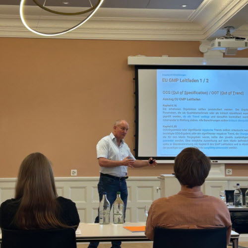 Besonders wertvoll waren die praxisnahen Beispiele sowie die „Todsünden“ bei Abweichungsmeldungen – typische Fehler, die es unbedingt zu vermeiden gilt. Im Anschluss beleuchtete Frank die Hintergründe der GMP-Richtlinien und deren Zielsetzung in der pharmazeutischen Industrie. Neben der historischen Entwicklung wurden vor allem praktische Aspekte und Erfahrungswerte aus dem GMP-Alltag vermittelt.
