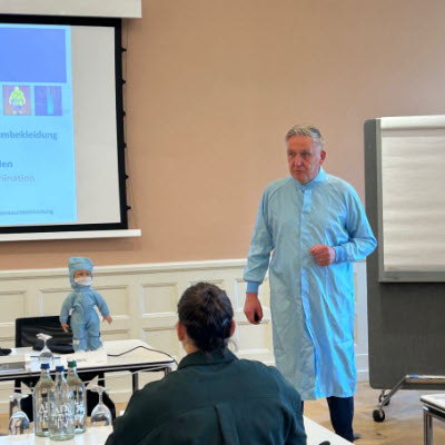 Nach dem fachlichen Input folgte die Vertiefung rund um Reinraumbekleidung durch Frederic Buehler und das "Fröilein Daxstex" von der Dastex Group GmbH. Dabei ging es um Anforderungen an die Reinraumbekleidung, die Vermeidung von Kontaminationen sowie die professionelle Aufbereitung in der Wäscherei. Im anschließenden Workshop standen typische Fehler beim Gowning im Mittelpunkt – inklusive konkreter Strategien zur Vermeidung von Fehlern im Anziehprozess.