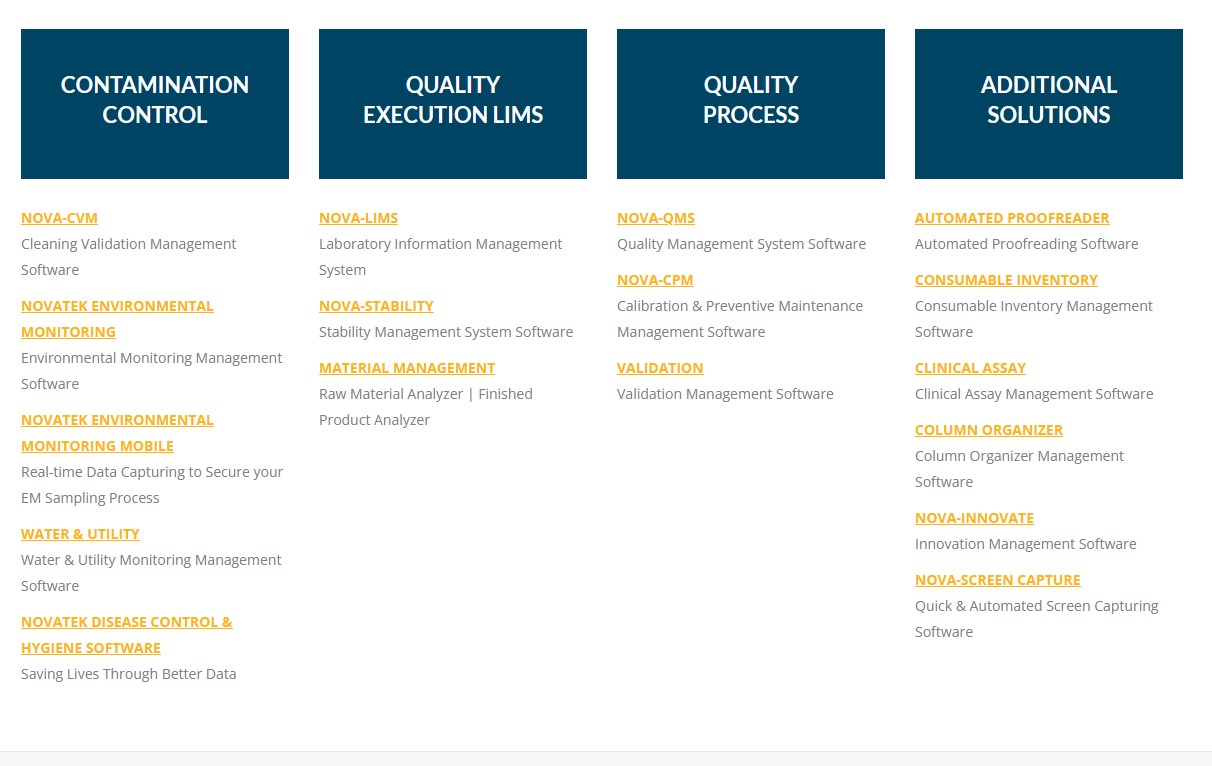 Novatek International bietet eine neue Art von allumfassenden, prozessgesteuerten LIMS- und anderen Softwarelösungen, die auf die pharmazeutische, biotechnologische und andere Gesundheitsbranche abzielen. Unser einzigartiges Portfolio an betriebsbereiten, benutzerfreundlichen Softwarelösungen umfasst spezialisierte Module, mit denen Sie alle Aspekte Ihrer Qualitätsumgebung mit weniger Aufwand und Zeit verwalten können. Novatek liefert Lösungen, die über LIMS hinausgehen, für eine vollständige unternehmensweite Automatisierung.