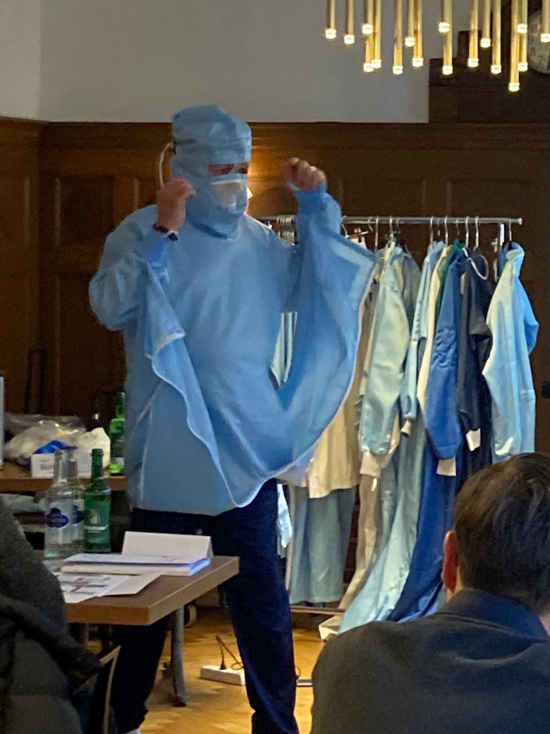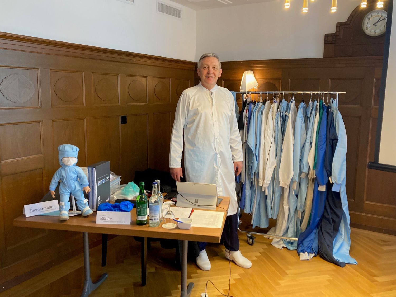 Frederic Buehler von der Firma Dastex Reinraumzubehör GmbH&Co.KG zeigte den Teilnehmern nach dem Mittagessen mit einem grossen Sortiment an Reinraumkleidern auf, wie man sich heute mit modernen Kleidern kontaminationsarm in reine Bereiche einschleust. Matchentscheidend ist es, wo der Reissverschluss angebracht ist. Ist dieser zwischen den Beinen oder am Rücken angebracht ist es viel einfacher das Kleid kontaminationsarm anzuziehen.