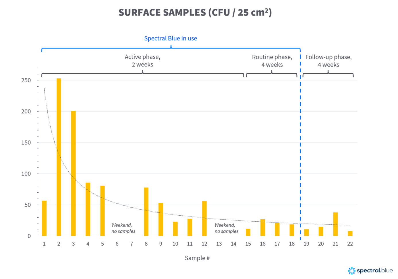 Während des Testzeitraums wurde ein deutlicher Abwärtstrend bei der mikrobiellen Kontamination beobachtet. Der Rückgang hielt auch nach Abschalten des Blaulichtsystems ab KW19 an. Eine plausible Erklärung ist, dass Spectral Blue™ trockene Biofilme im Raum beseitigt und damit die Wirksamkeit herkömmlicher Reinigungsmethoden erhöht hat. Der Rückgang hielt auch nach Abschalten des Blaulichtsystems ab KW19 an. Lesen Sie den vollständigen Artikel auf: