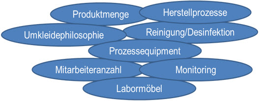 Um ein behördenkonformes Layout zu entwickeln, müssen zu Beginn alle GMP- und auch alle non-GMP-Faktoren betrachtet werden, wovon die Wichtigsten in den beiden nachfolgenden Abbildungen illustriert sind.