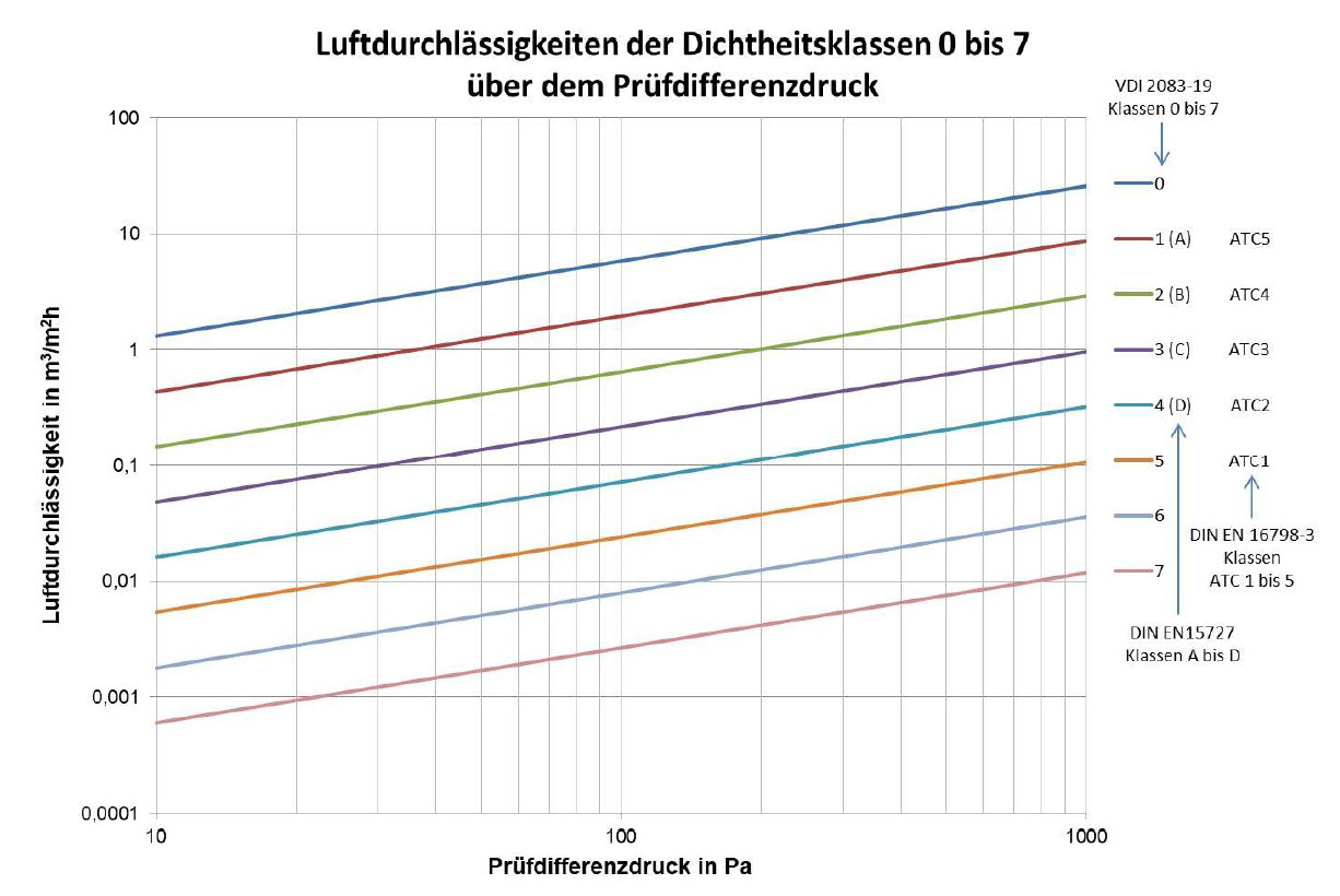 Die Richtlinie bietet eine einheitliche Klassifizierung für verschiedenste Anwendungen im reinen Umfeld ausgehend von Reinräumen über Isolatoren bis hin zu Hochsicherheitslaboren. Die Klassifizierung der Luftdichtheit von Containments stützt sich auf die Definitionen in DIN EN 15727. Die Luftkanaldichtheitsklassen A bis D nach DIN EN 15727 sind in die in der Abbildung 3 dargestellten Dichtheitsklassen von Containments integriert und sind mit den Dichtheitsklassen 1 bis 4 identisch. Zudem sind die Dichtheitsklassen nach der neuen Norm DIN EN 16798 mit aufgeführt. Damit ist es möglich, ein Gesamtsystem, das aus einem oder mehreren Räumen und den zugehörigen Luftkanälen und Komponenten (z. B. Filter- und Klappengehäuse) besteht, als Einheit zu prüfen. Die Luftdurchlässigkeit ist auf die Hüllfläche des Containments bezogen. Da zu jedem Containment ein gewisser Anteil an Lüftungskanälen gehört, ergibt sich hier eine Übereinstimmung der Dichtheitsanforderungen.