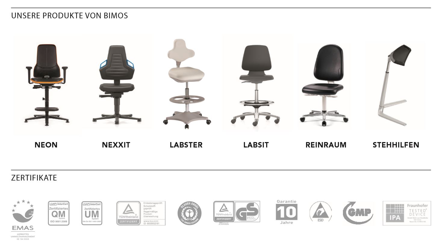 Durch das grosse Produktportfolio und flexible Anpassungsmöglichkeiten erreicht Bimos eine ideale Einsatzeignung für wirklich jede Arbeitsplatzanforderung. Der enge Kontakt zu Anwendern aus der Praxis und zur Arbeitswissenschaft versetzt Bimos in die Lage, rasch und bedarfsgetrieben zu entwickeln.