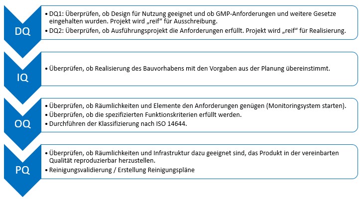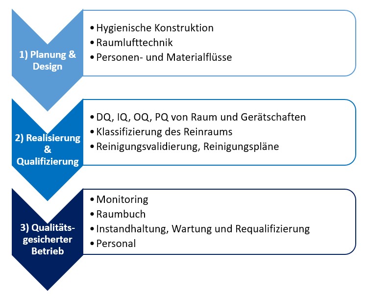 Die Betriebshygiene in reinen Bereichen ist besonders wichtig. Aus diesem Grund ist nach Qualifizierung des Raumes auch noch eine Reinigungsvalidierung durchzuführen, um Kontaminationen vorbeugen zu können und Partikelwerte tief halten zu können: