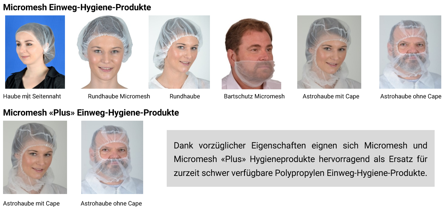 Einweg-Hygienebekleidungen werden fast ausschliesslich aus Polypropylen Vlies unterschiedlicher Materialstärken hergestellt. Für diese Hygieneprodukte fehlte plötzlich das Ausgangsmaterial Vlies. Es ist deshalb zu erwarten, dass das fehlende Vlies zu massiven Lieferengpässen bei Vlies-Einweg-Hygienebekleidungen führen wird und dies über längere Zeit. Die Alternative zu Polypropylen-Vlies ist Polyamid Micromesh und Micromesh «Plus»