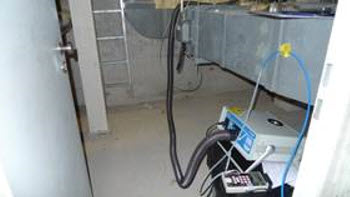 Bild 2: Messaufbau im nur circa 1m hohen Kriechkeller unter dem S3-Labor. „Meist ist es nicht das Nachjustieren an sich, welches mit großem Aufwand verbunden ist, sondern die Zugänglichkeit. Dies macht nachträgliche Arbeiten an Laboren und Reinräumen so aufwändig“, so Michael Kuhn, Leiter des STZ EURO in Offenburg. |