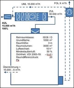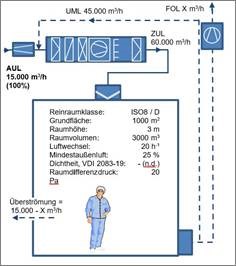 Abbildung 2: Beispiel für einen undichten konservativ ausgelegten Reinraumbereich, mit verbesserter Energieeffizienz, der mit üblicher Absenkmethode betrieben wird.