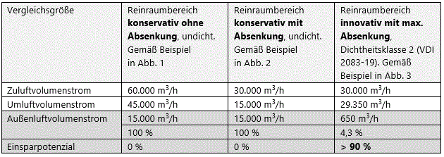Denn begrenzt man während des Absenkbetriebs nicht nur die Aktivität der Ventilatoren, sondern auch die Zuführung frischer Außenluft, so ließe sich weitaus mehr Potenzial heben. Frische Außenluft muss geheizt, gekühlt, be- und entfeuchtet werden. Proportional zum Außenluftvolumenstrom lässt sich hier ein Energieeinsparpotenzial gegenüber dem Normalbetrieb von über 90 % realisieren. Voraussetzung hierfür wäre die Umsetzung eines Dichtheitskonzepts auf Basis der VDI 2083-19. Denn über die definierte Dichtheit nach VDI 2083-19 kombiniert mit einem schlüssigen Lüftungs- und Automatisierungskonzept, wird die Absenkung über die drastisch reduzierte Zufuhr des Außenluftstroms nicht nur energieeffizient, sondern auch die Einhaltung definierter Grenzwerte wie z.B. der Raumdifferenzdruck sicherstellt.