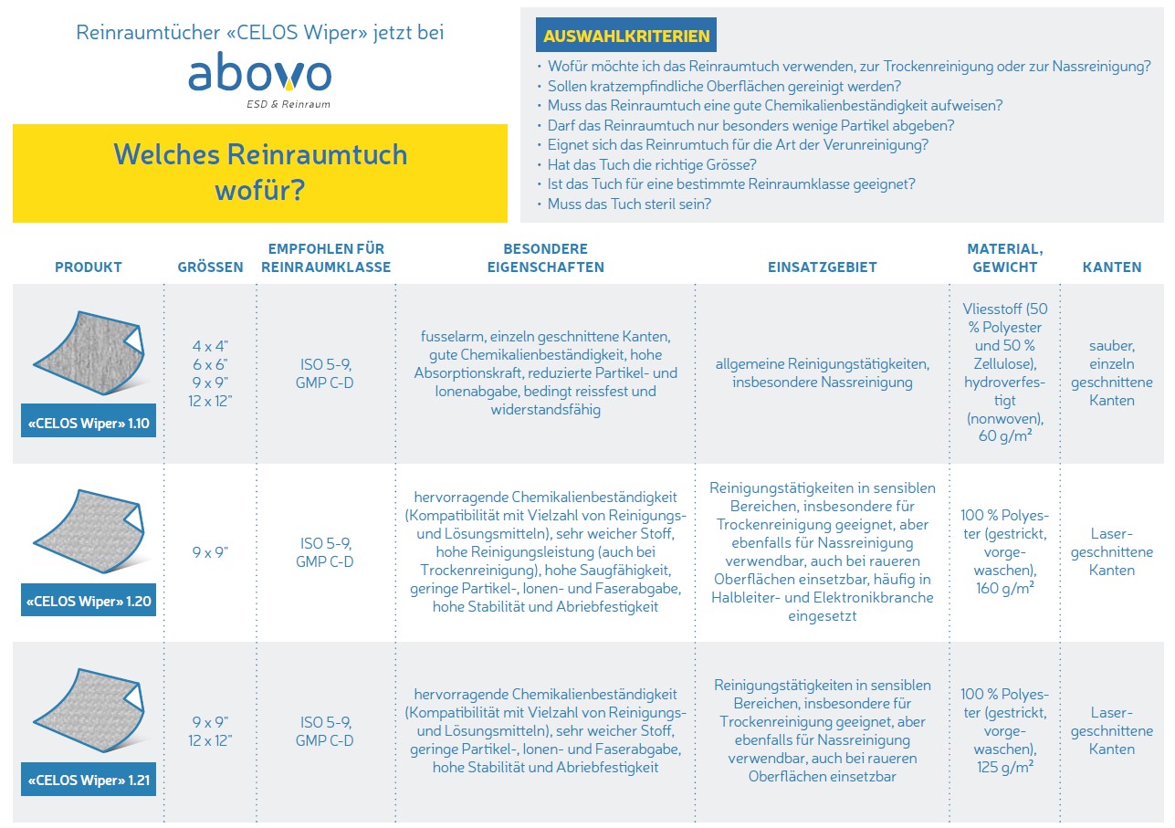 Eine Übersicht aller CELOS Wiper Reinraumtücher finden zu auf der Webseite von abovo.ch zum Download.