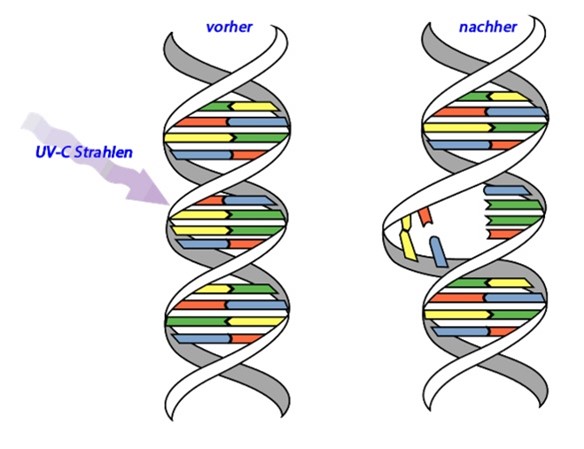 Die UV-Strahlen sind beispielsweise auch im Sonnenlicht enthalten und wurden schon in der Antike wegen ihrer keimtötenden Wirkung genutzt. Aufgrund der zerstörerischen Eigenschaft der UV-C-Strahlung, welche die DNA bzw. RNA spaltet, wird die Vermehrung und die Überlebensfähigkeit der Zellen blockiert.