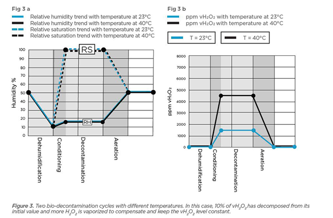 In den Abbildungen 3a und 3b (unten) werden zwei Biodekontaminationszyklen dargestellt. Der durch schwarze Linien dargestellte Zyklus zeigt eine Prozesstemperatur von 40 °C, und die blauen Linien repräsentieren eine Temperatur von 23 °C. In beiden Fällen wird eine Entfeuchtung durchgeführt, um Feuchte vor der Konditionierung auf 10 % zu senken, und bei beiden wird dieselbe H2O2-Lösungskonzentration (59 %-m) eingesetzt. Die schwarze Linie in Abbildung 3b zeigt, dass die Temperatur von 40 °C einen höheren vH2O2-ppm-Wert zulässt als die Temperatur von 23 °C.