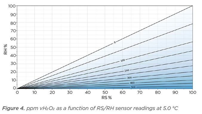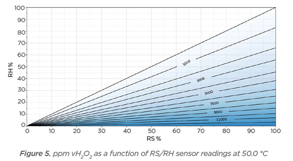 In der Abbildung 4 unten sehen Sie die vH2O2-ppm mit einer Temperatur von 5 °C. Die relative Sättigung liegt auf der x-Achse und die relative Feuchte auf der y-Achse. Die Koordinatenlinien innerhalb der x- und y-Achsen repräsentieren die H2O2-Dampfkonzentration von 0 bis etwa 500 ppm. Die 0-ppm-Linie stellt Dampf dar, der nur mit reinem Wasser erzeugt wurde. Wenn die H2O2-Lösungskonzentration erhöht wird, nimmt auch vH2O2 zu. Theoretisch repräsentiert die Linie entlang der x-Achse einen Dampfgehalt, der durch eine 100-%-H2O2-Flüssigkeit erzeugt wurde. Kondensation tritt auf, sobald die relative Sättigung 100 %rS beträgt und die vH2O2-ppm danach nicht mehr erhöht werden können. Bei einer Temperatur von 5 °C, einer anfänglichen relativen Feuchte von 0 %rF und der Verdampfung einer 100-%-m-H2O2-Lösung beträgt der theoretisch maximal erreichbare vH2O2-ppm-Wert demnach 548 ppm. Alle Bedingungen in Abbildung 5 sind dieselben wie in Abbildung 4 (0 %rF, 100-%-m-Lösung), und nur die Temperatur wurde auf 50 °C geändert. Der theoretisch maximal erreichbare vH2O2-ppm-Wert beträgt nun 13 019.