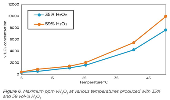 Abbildung 6 zeigt die maximalen vH2O2-ppm bei verschiedenen Temperaturen und unter Verwendung unterschiedlicher H2O2-Lösungskonzentrationen. Wir vergleichen zwei häufig verwendete H2O2-Lösungskonzentrationen: 35 % und 59 %. Die blaue Trendlinie repräsentiert eine 35-%-H2O2-Lösung. Bei einer Temperatur von 40 °C beträgt der maximal erreichbare vH2O2-ppm-Wert 4 210. Bei gleicher Temperatur (40 °C) ergibt eine 59-%-H2O2-Lösung einen maximal erreichbaren vH2O2-ppm-Wert von 5 461.
